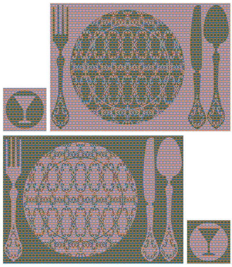 Both products are designed with a silhouette of dining elements coated in one pattern while in the background the inverted color scheme is used to further highlight the contrast between shape and color. On the back of the product, the color scheme is switched out to create the same image but with a different vibe because of the color shift. This will also give you the option to choose which side you prefer (front or back).